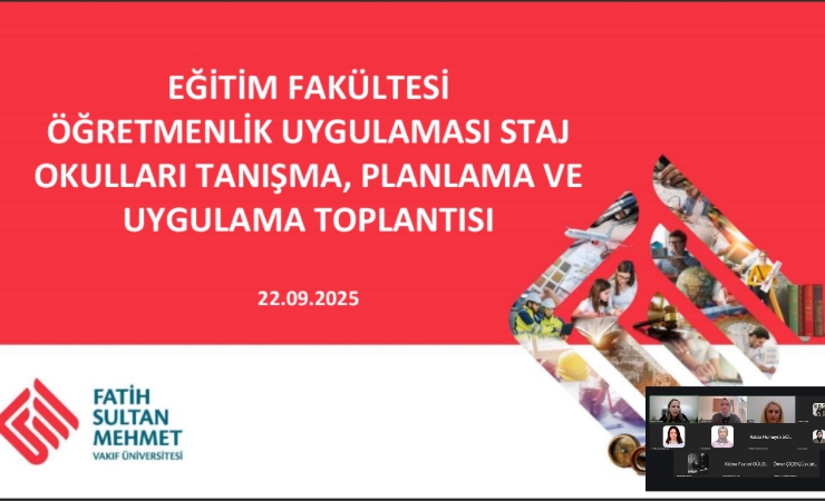 Eğitim Fakültesi Öğretmenlik Uygulaması koordinatörleri, öğretim üyeleri ve Millî Eğitim Bakanlığına bağlı okul yöneticilerinin katılımıyla 22 Eylül 2025 Pazartesi günü saat 15.00’te çevrim içi olarak Öğretmenlik Uygulaması Koordinasyon Toplantısı gerçekleştirilmiştir.